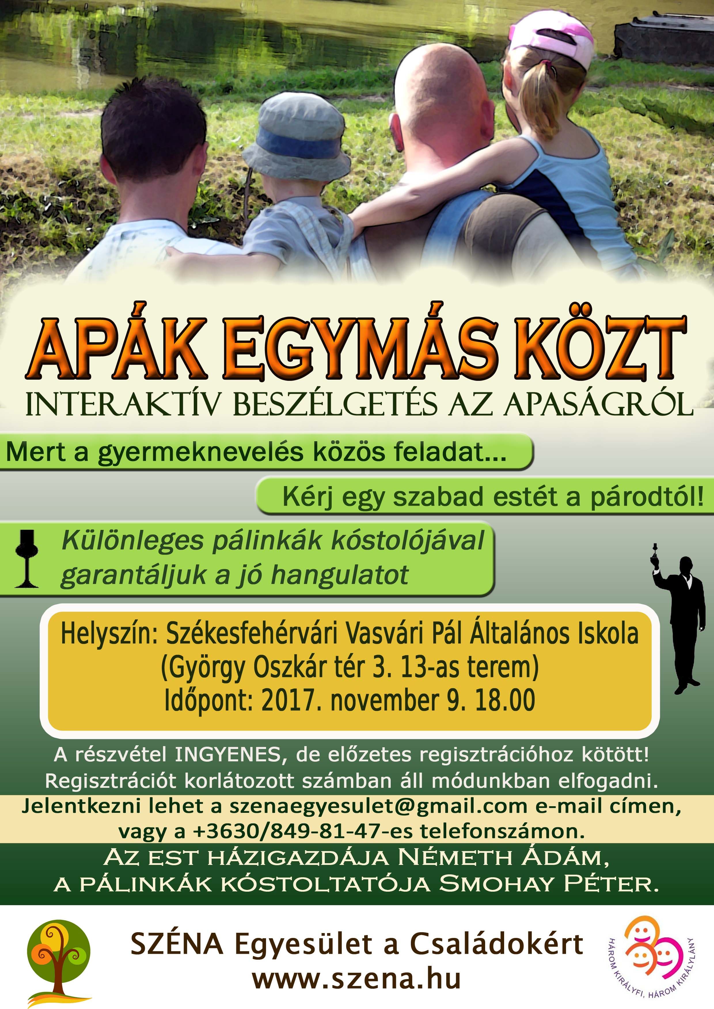 A SZÉNA Egyesület a Három Királyfi, Három Királylány Alapítvány székesfehérvári képviselőjeként november 9-én 18 órától az édesapákat invitálja programjára, ahol az apaság és az apai szerep lesz a téma. A rendezvény helyszíne a Vasvári Pál Általános Iskola lesz.