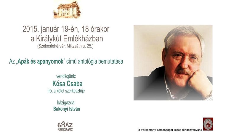2015. január 19-én, hétfőn este kezdődik az "Apák és apanyomok" című antológia bemutatása a Királykút Emlékházban (Mikszáth utca 25.). Az est vendége a kötet szerkesztője, Kósa Csaba író, míg a házigazda Bakonyi István irodalomtörténész lesz. Az este 18 órakor kezdődő ingyenes, kulturális programra sok szeretettel várnak minden érdeklődőt.