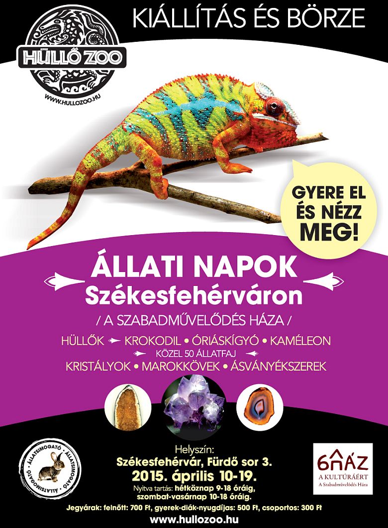 2015. április 10-én, pénteken reggel 9 órától látogatható az "Állati napok Székesfehérváron" című kiállítás A Szabadművelődés Házában. Az április 10-től 19-ig látogatható programon új lakókat lehet megtekinteni az intézmény aulájában. Az érdeklődők közel 50 állatfajt, így többek között a kígyókat, a kaméleonokat és a pókokat is megnézhetik.
