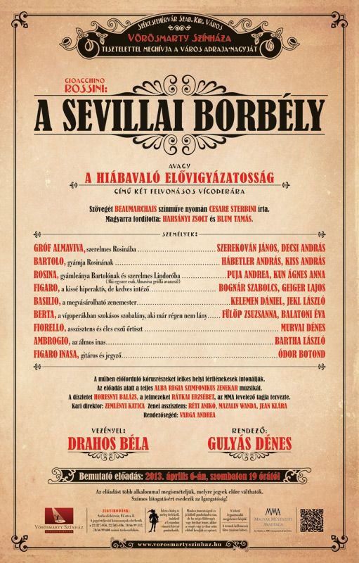 Április 6-án mutatja be a Vörösmarty Színház Giacchino Rossini:A Sevillai borbély avagy a hiábavaló elővigyázatosság című két felvonásos vígoperát. Áprilisban összesen 3 előadás lesz, jegyek még kaphatóak a 2013. április 8-ai előadásra. A történet szerint a sevillai borbély jó pénzért minden problémát megold. Még Almaviva gróf és a szépséges Rosina is révbe érhet, ha ő segít. Szerelmi cselszövés Rossini csodálatos zenéjével.