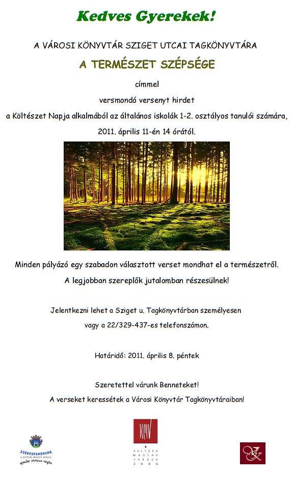Április 11-én, hétfőn 14.00 órakor szavalóversenyt rendez „A természet szépsége” címmel a Városi Könyvtár Sziget Utcai Tagkönyvtára. A Költészet Napja alkalmából minden évben szerveznek városi versmondó versenyt az 1-2. osztályosoknak. Az idén természettel kapcsolatos művekkel lehet jelentkezni.