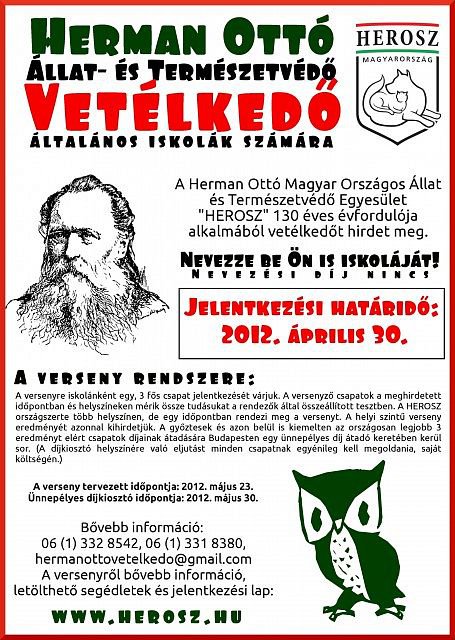 Általános iskolásoknak szervezik meg a Herman Ottó állat- és természetvédelmi vetélkedőt a Herosz Egyesület megalakulásának 130. évfordulója alkalmából. Az országos szintű tudáspróbára egy időpontban, öt városban - köztük Székesfehérváron - kerül sor, nevezni április 30-ig lehet.