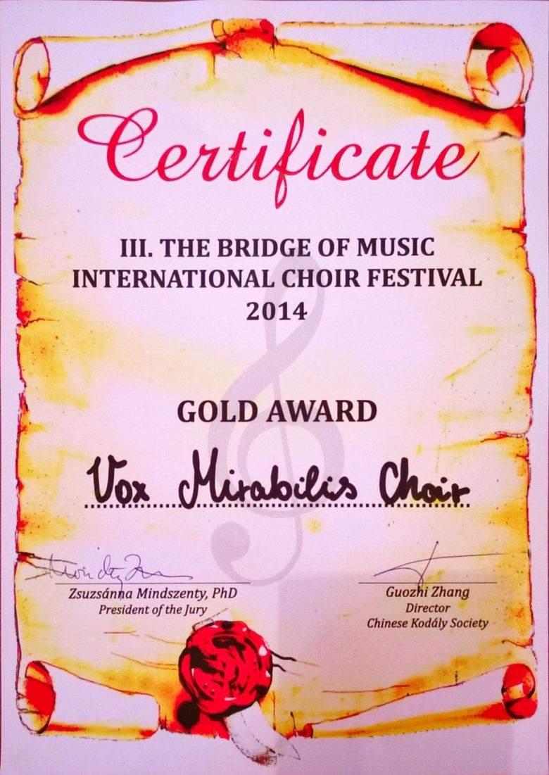 A Vox Mirabilis Kamarakórus is ott volt a versenyző együttesek között, és most is, mint eddig, magas színvonalú műsorral készült a megmérettetésre. A zsűri a székesfehérvári kamarakórust a legmagasabb pontszámmal arany díjjal jutalmazta, így a kórus a mezőny élén végzett! A díjátadó a MOM Kulturális Központban volt, ahol a zene, az éneklés töltötte be a közvetítő híd szerepét, amelyen keresztül a különböző kultúrájú emberek megismerhették egymás szépségét, méltóságát - és mindazt, ami közös bennük.