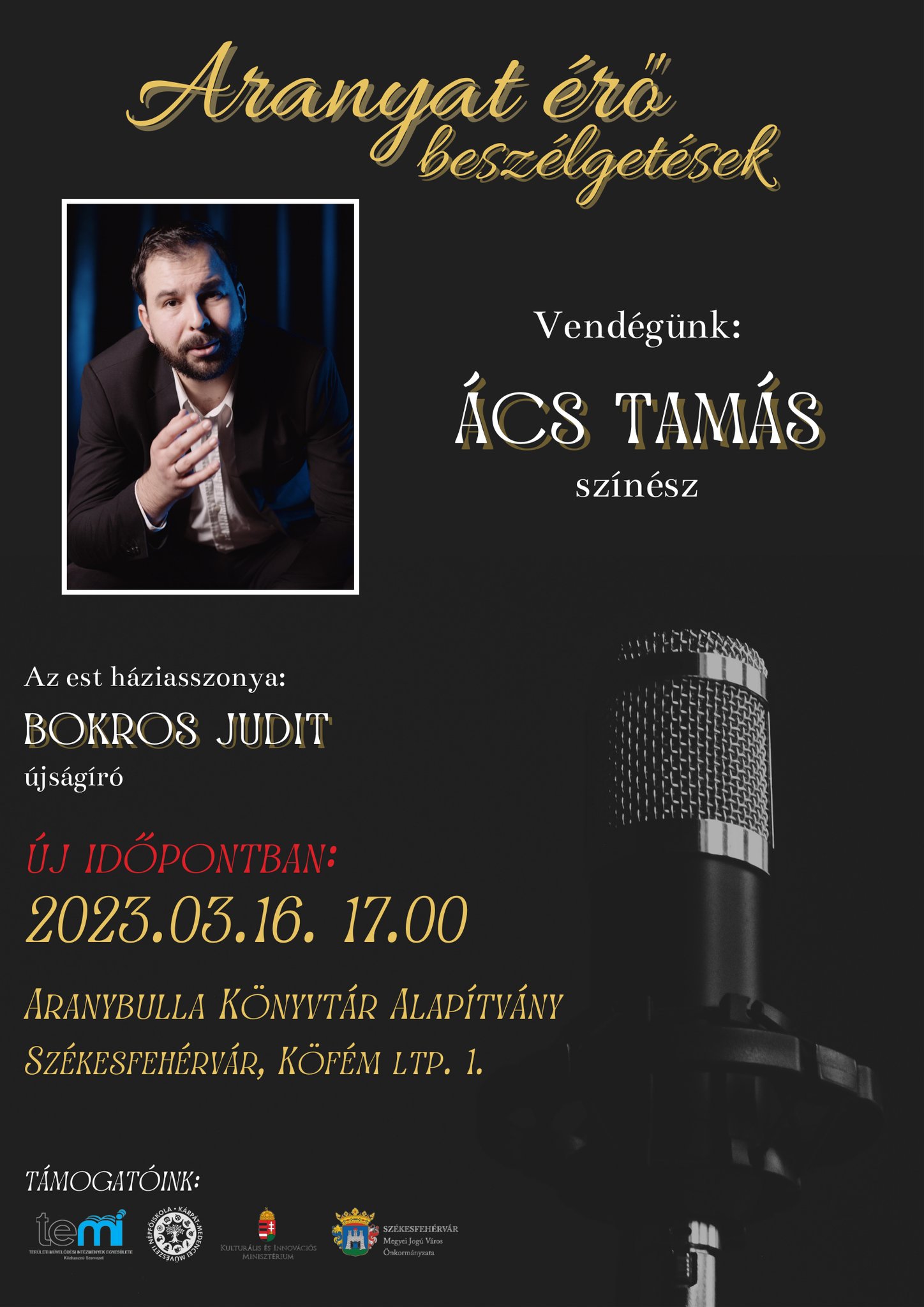 Március 16-án csütörtökön 17 órakor folytatódnak az Aranyat érő beszélgetések az Aranybulla Könyvtárban, ezúttal Ács Tamás színművész lesz a vendég.
