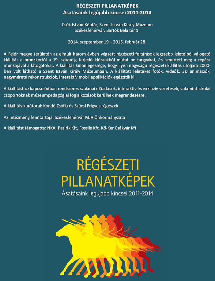 Demeter Zsófia múzeumigazgató elmondta, hogy a Régészeti pillanatképek - Ásatásaink legújabb kincsei 2011-2014 című kiállítás az elmúlt három év ásatásait mutatja be, amelyek a Székesfehérvár történetére vonatkozó új és látványos eredmények mellett megyeszerte hoztak jelentősnek mondható eredményeket. A fiatal régészek munkáját dicsérve elmondta, hogy a korábbiaknál sokkal gyorsabban be tudják mutatni a leletanyagot és közel tudják vinni a közönséghez.