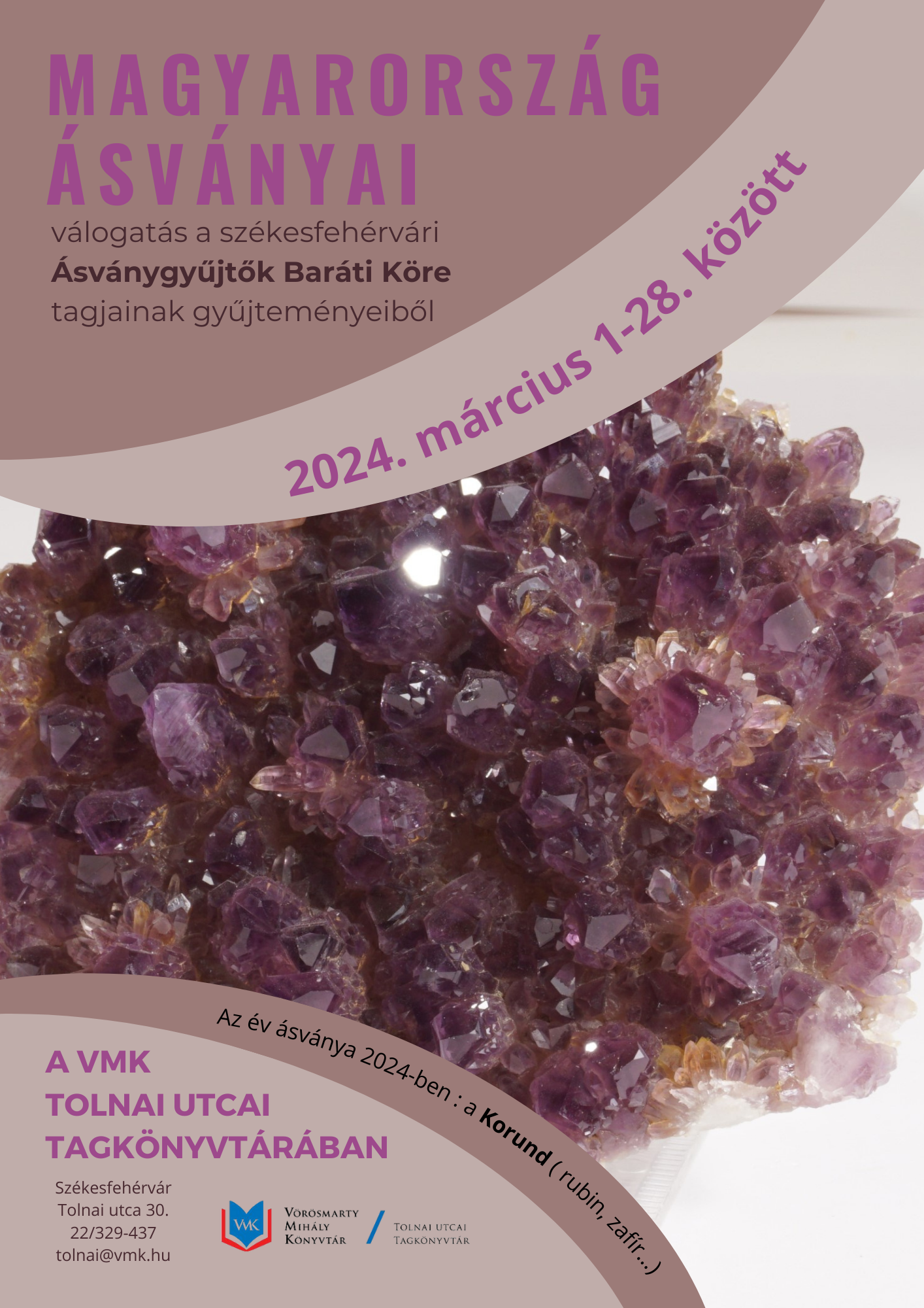Március 1-jén, péntektől a Tolnai utcai Tagkönyvtár nyitvatartási idejében Magyarország Ásványai címmel nyílik kiállítás a Székesfehérvári Ásványgyűjtők Baráti Kör tagjainak gyűjteményéből.