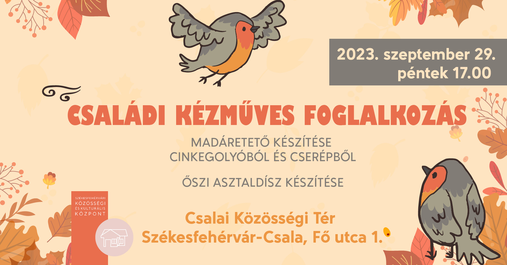 Az őszi termések, színek inspirálják azt a kézműves délutánt, amelyet szeptember 29-én, pénteken öt órai kezdettel rendez a Székesfehérvári Közösségi és Kulturális Központ a Csalai Közösségi Térben. A résztvevők őszi asztaldíszt és madáretetőt is készíthetnek majd a programon. A részvétel ingyenes.