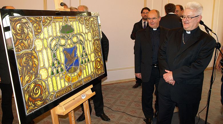 Ezt követően a levéltár által felújítatott Prohászka Ottokár püspök címerét ábrázoló ólombetétes üveg ünnepélyes átadására került sor. „A történelem tele van csodákkal, a világ eseményei gazdagságban. Ha az ember értő szemmel és szívvel, valamint tanulékony akarattal szemléli ezeket, akkor képes jobbá tenni a világot. Ha elfordul a valóságtól, és önmagába zárkózik, akkor nem képes építeni. Mindig meghatott az ember, amikor annyi év után ismét ebben a kápolnában állhat meg, és gondolhat a régi emberekre, akik már nincsenek közöttünk, az ő nagylelkűségükre, arra, amit hitükből és emberi tartásukból létre tudtak hozni. Nagyprépost Úr példája azoknak a példája, akik nem birtokolni akartak, hanem adni, amit csak lehet. Csodálatos, hogy ma Prohászka címere előtt állhatunk ebben a kápolnában” – mondta el köszöntőjében Spányi Antal megyés püspök, aki kiemelte: az 1943-ban készült ólombetétes díszüveg a Székesfehérvári Egyházmegyei Múzeumban található Prohászka Kiállítás legféltettebb darabja lesz.