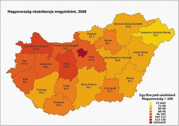 Budapest vásárlóerő szintje 35 százalékkal meghaladja az országos átlagot, s a leggazdagabb kerület a XII., ahol 162 százalékos a mutató. A megyék között második helyen továbbra is tartja magát Győr-Moson-Sopron 107,4 százalékkal, de az országos átlag fölötti vásárlóerőt tud felmutatni továbbá Fejér, Pest, Komárom-Esztergom, és Vas megye.