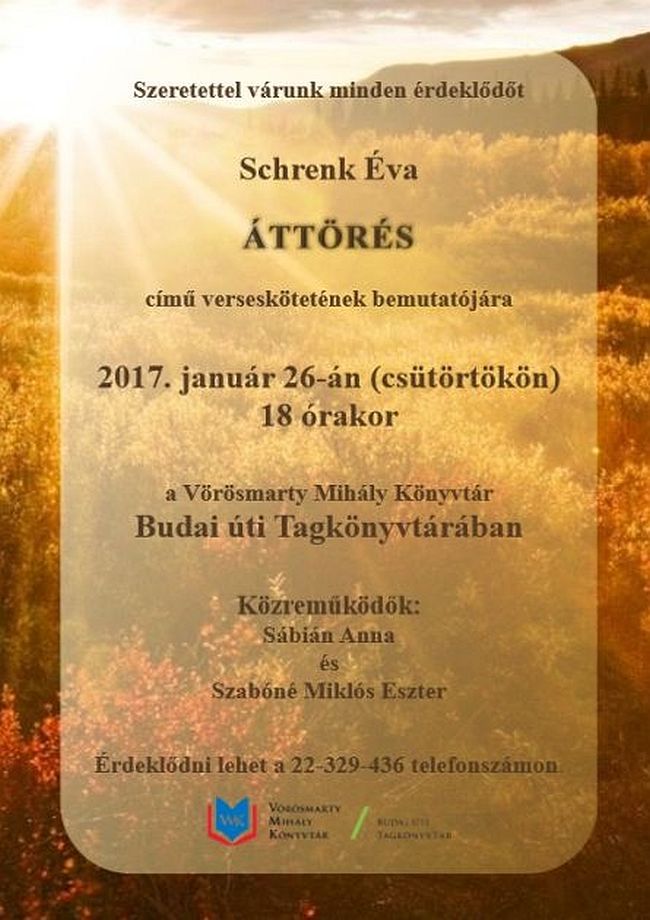 A Vörösmarty Mihály Megyei Könyvtár Budai úti Tagkönyvtárában január 26-án, csütörtökön 18 órakor bemutatják Schrenk Éva Áttörés című verseskötetét. Két év lírai termését gyűjti össze a kötet. Steinbach József református püspök gazdagságukban csiszolt gyémántokhoz hasonlítja a rövid, tömör verseket, amelyek emberré nevelnek, felvállalva a valós tapasztalatokat, érzéseket és a krisztusi hitvallást. A címadó versben ezt olvashatjuk: „Hánykolódik bennem a Lélek./ Mit is tehetne mást, hisz félek./ Lecsendesíteni képtelen vagyok,/ de a háttérben Arcod felragyog. (…)” A csütörtöki rendezvényen közreműködik Sábián Anna és Szabóné Miklós Eszter. Minden érdeklődőt szeretettel várnak!