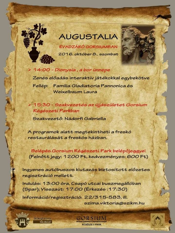 Gorsiumban október 8-án, szombaton évadzárót tartanak AUGUSTALIA címmel. A programok 14 órakor kezdődnek: a Dionysia, a bor ünnepe című zenés előadást mutatják be interaktív játékokkal egybekötve. A produkcióban fellép a Familia Gladiatoria Pannonica és Weixelbaum Laura.