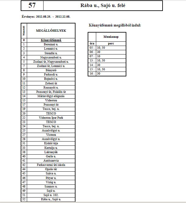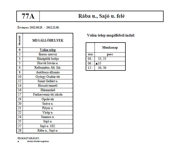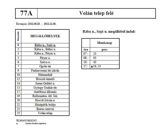 | 77A | Volán telep - Rába u., Sajú u. | LETÖLHETÕ (.pdf) | |||