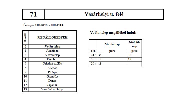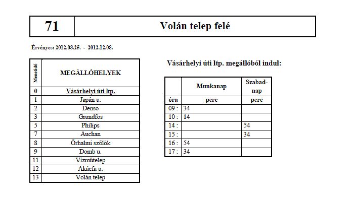| 71 | Volán telep - Vásárhelyi úti ltp. | LETÖLHETÕ (.pdf) | |||