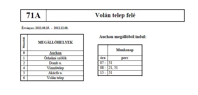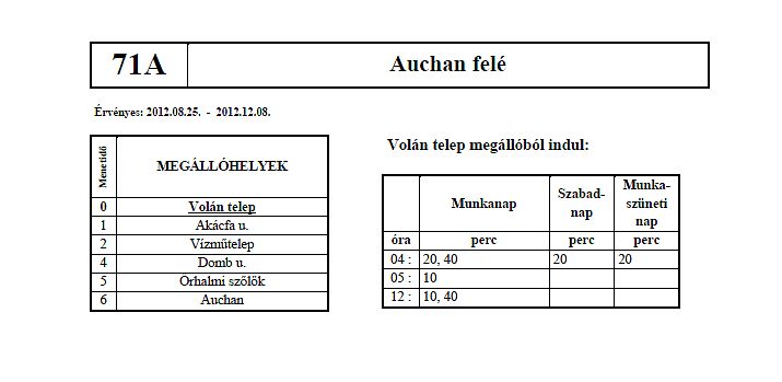 | 71A | Volán telep - Auchan | LETÖLHETÕ (.pdf) | |||
