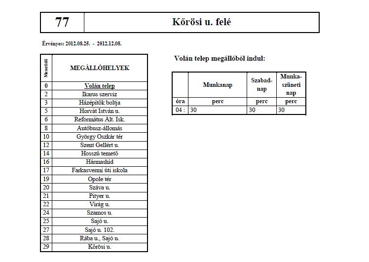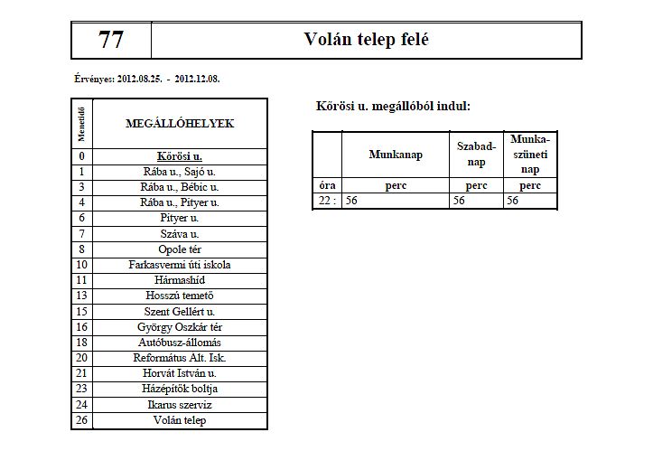 | 77 | Volán telep - Körösi u. | LETÖLHETÕ (.pdf) | |||