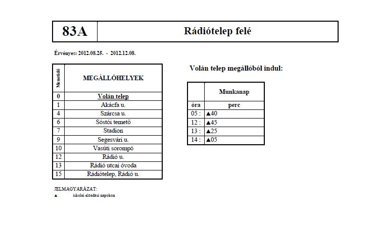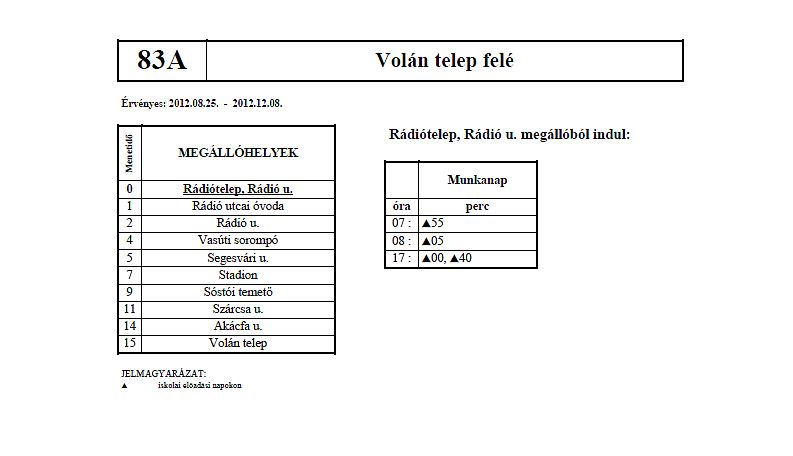 | 83A | Volán telep - Rádiótelep, Rádió u. | LETÖLHETÕ (.pdf) | |||