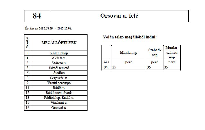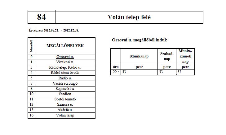 | 84 | Volán telep - Orsovai u. | LETÖLHETÕ (.pdf) | |||
