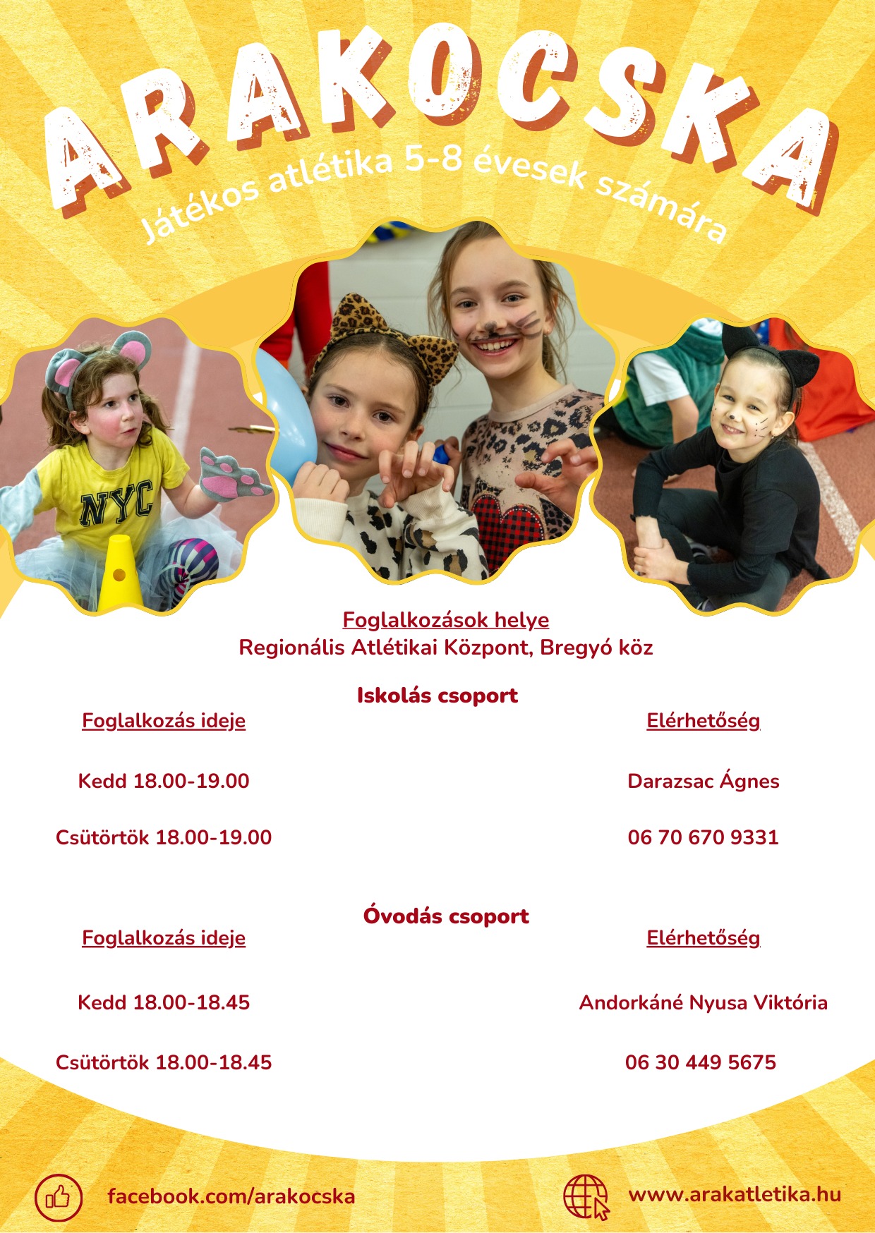 A szervezők szeretettel várnak minden mozogni vágyó kisgyermeket a foglalkozásokra, bővebb információ a megadott telefonszámokon és a facebook.com/arakocska oldalon olvasható!