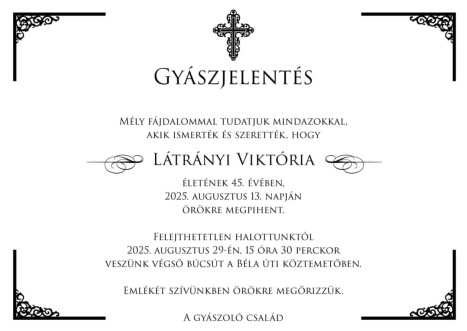 Augusztus 29-én kísérik utolsó útjára szerettei, pályatársai Látrányi Viktória újságírót. A fájdalmasan fiatalon elhunyt kommunikációs, televíziós szakembert a Béla úti temetőben búcsúztatják.