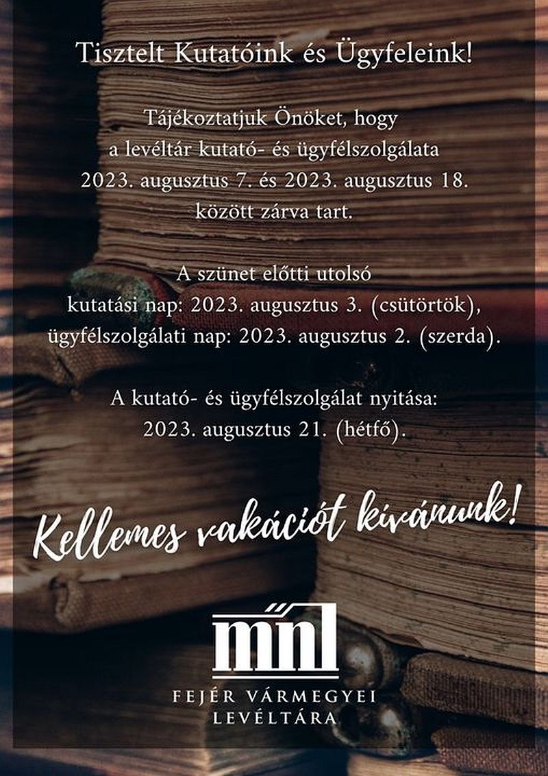 A Magyar Nemzeti Levéltár Fejér Vármegyei Levéltárának kutató- és ügyfélszolgálata augusztus 7. és 18. között zárva tart. A szünet előtti utolsó kutatási nap augusztus 3.