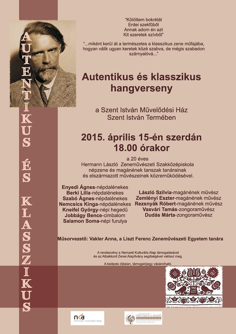 Autentikus és klasszikus hangversenyt rendeznek április 15-én szedán 18 órakor a Szent István Művelődési Házban a 20 éves Hermann László Zeneművészeti Szakközépiskola népzene és magánének tanszak tanárainak és elszármazott művészeinek közreműködésével. A rendezvény a Nemzeti Kulturális Alap támogatásával valósul meg.