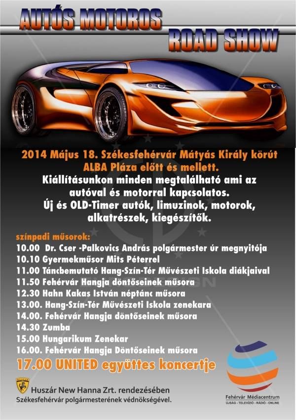 Autós, motoros road show-t rendeznek május 18-án, vasárnap Székesfehérváron az Alba Pláza előtti téren és a Mátyás király körúton, ahol új és old-timer autók és motorok mellett alkatrészek és kiegészítők is megtalálhatóak lesznek, továbbá délelőtt gyermekműsorral, táncbemutatóval és koncertekkel várják az érdeklődőket.