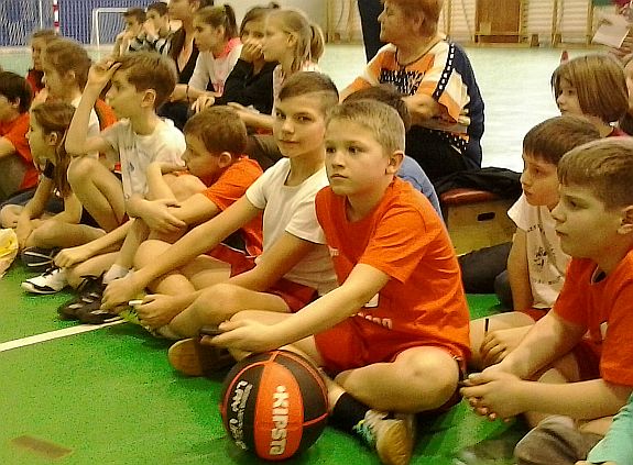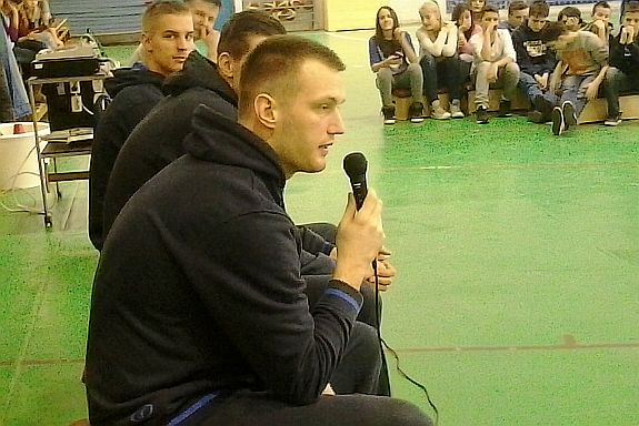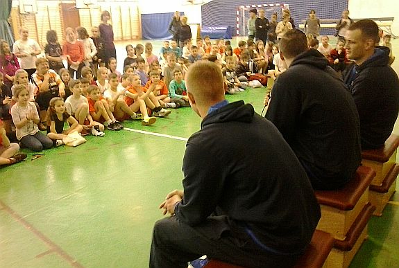 A beszélgetés után jöhetett a játék, a város legnagyobb tornatermében ezúttal a kosárlabda egy sorverseny kellékeként kapott szerepet. A három játékos egy-egy csapat tagja lett, őket is bevonták a labdavezetéses, passzolós, ügyességi feladatokba. Némi megilletődöttség érezhető volt a gyerekeken az elején, de hamar belejöttek, az albás fiúk pedig mindent megtettek, hogy saját csapatuk végezzen az első heylen egy-egy versenyszámban. Végül nem maradhatott el a csapatfotók, naptárak, relikviák kiosztása, aláírása sem. Ez az iskolalátogatás is igazi siker volt, hamarosan folytatása következik.