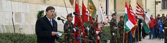 Ezt követően Dr. Vizi László Tamás tanszékvezető, a Kodolányi János Főiskola tanára mondott ünnepi beszédet. „Alig találunk a magyar történelem korszakait vizsgálva olyan évszázadot, amennyiben a magyarság ne vívta volna ki a világ, de legalábbis Európa elismerését, odafigyelését, tiszteletét. Ha csak a mögöttünk hagyott három évszázadot vizsgáljuk, így volt ez a Rákóczi szabadságharc, az 1848-as forradalom és szabadságharc idején és 1956-ban is.” – kezdte beszédét Dr. Vizi László Tamás, majd hozzátette: egyik forradalmunkat sem sikerült a nagypolitika színpadára emelni.