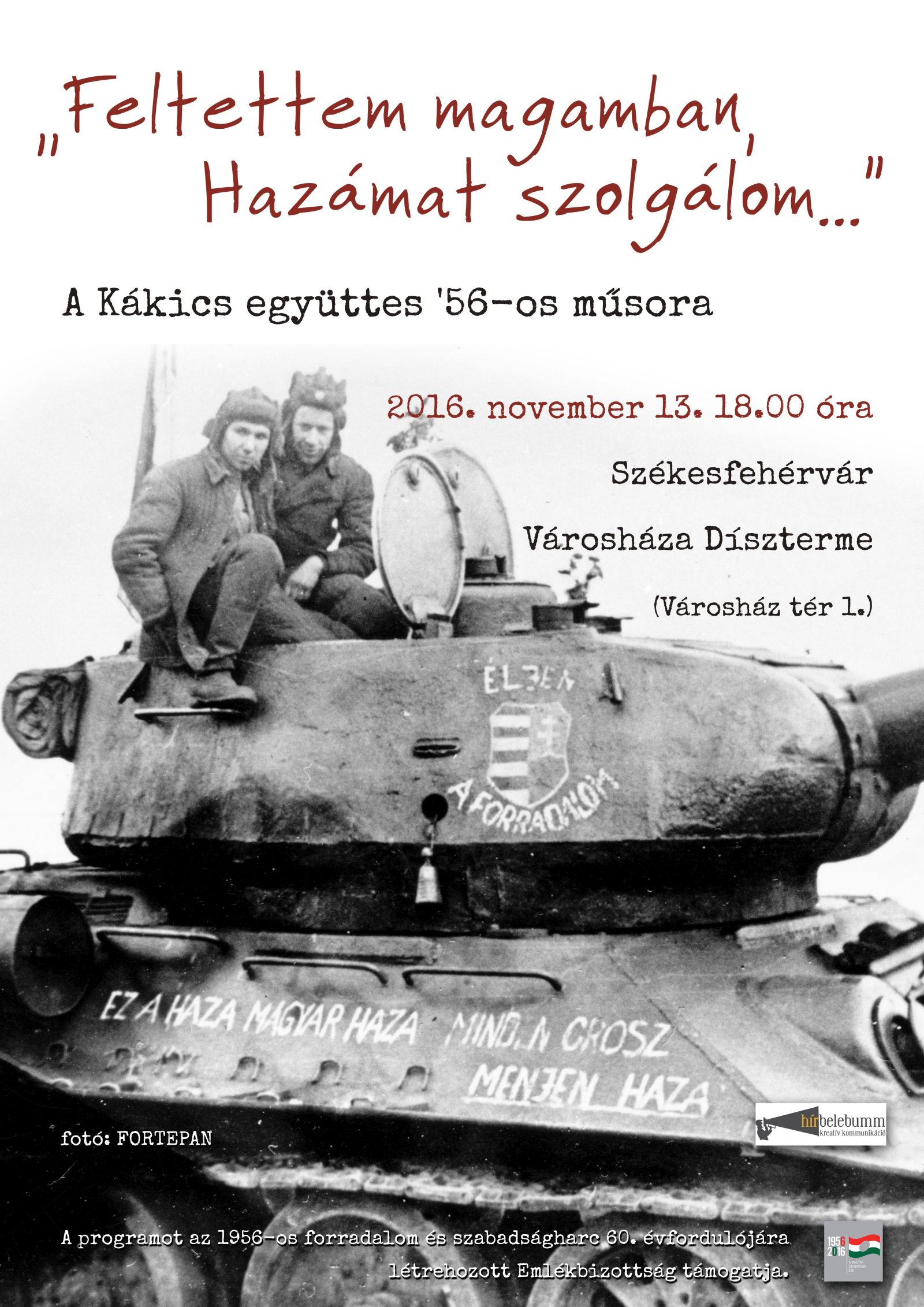 A programot az ’56-os forradalom és szabadságharc 60. évfordulójára létrehozott Emlékbizottság támogatta. A belépés ingyenes. Szeretettel várnak minden érdeklődőt!