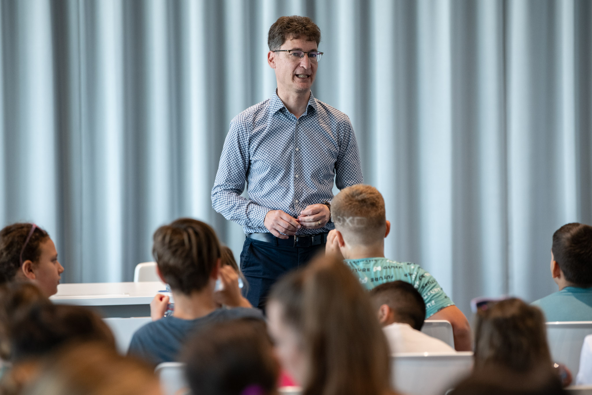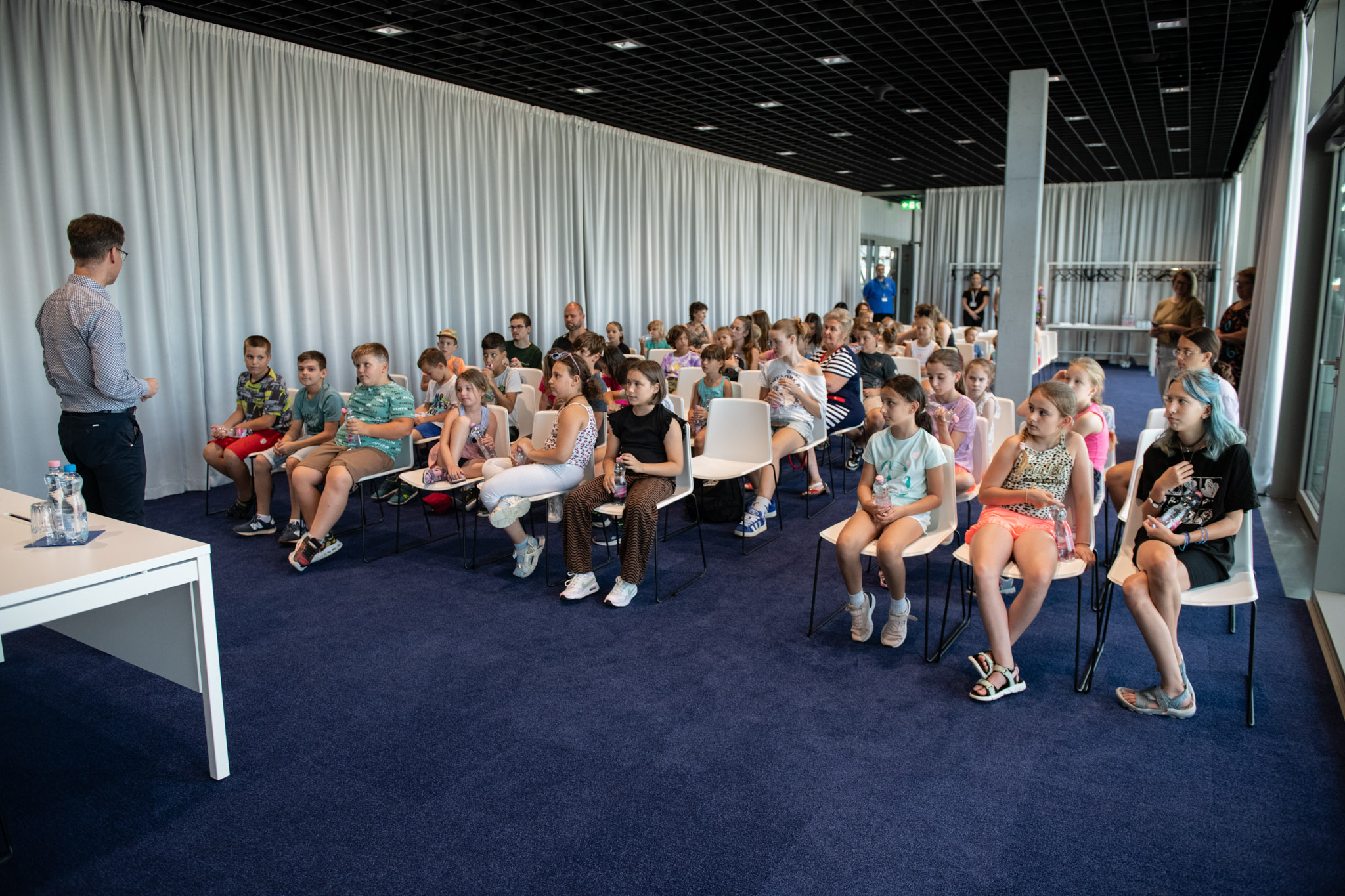 Dr. Cser-Palkovics András az Alba Aréna bejárását követően beszélgetett az ifjú táborozókkal, akik örömmel osztották meg vele nyári élményeiket.