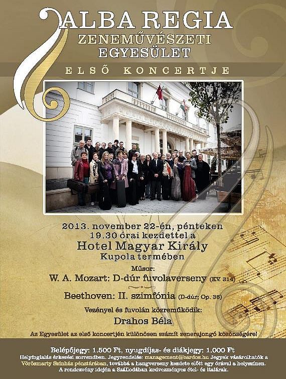 Első koncertjét rendezi november 22-én, pénteken az Alba Regia Szimfonikus Zenekar tagjaiból álló Alba Regia Zeneművészeti Egyesület. A program 19.30 órakor kezdődik a Hotel Magyar Király Kupolatermében. A helyfoglalás érkezési sorrendben történik.