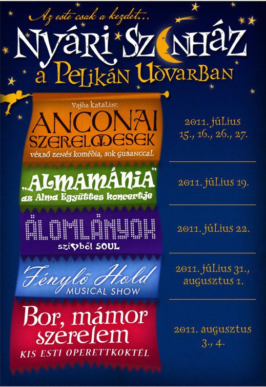 A repertoár minden produkciója zenés; soul, musical, operett, tánczene is szerepel a műfajok között. A gyermekekről sem feledkeznek meg a szervezők – az Alma Együttes is koncertezik majd. A Nyári Színház állandó helyszíne a Pelikán Udvar. Minden előadásnak van esőnapja, így nem marad el egyik sem rossz idő miatt.