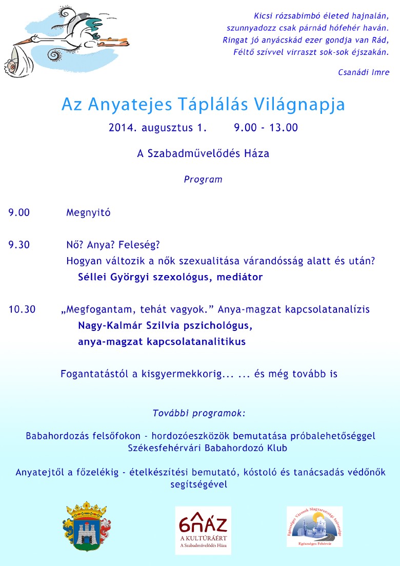 Augusztus 1-jén az anyatejes táplálás világnapja alkalmából rendeznek programokat A Szabad- művelődés Házában, ahol a nő, anya és feleség szerepekről, valamint az anya-magzat kapcsolatról is szó lesz. A világnapon babahordozásra alkalmas eszközöket is kipróbálhatnak majd a résztvevők.