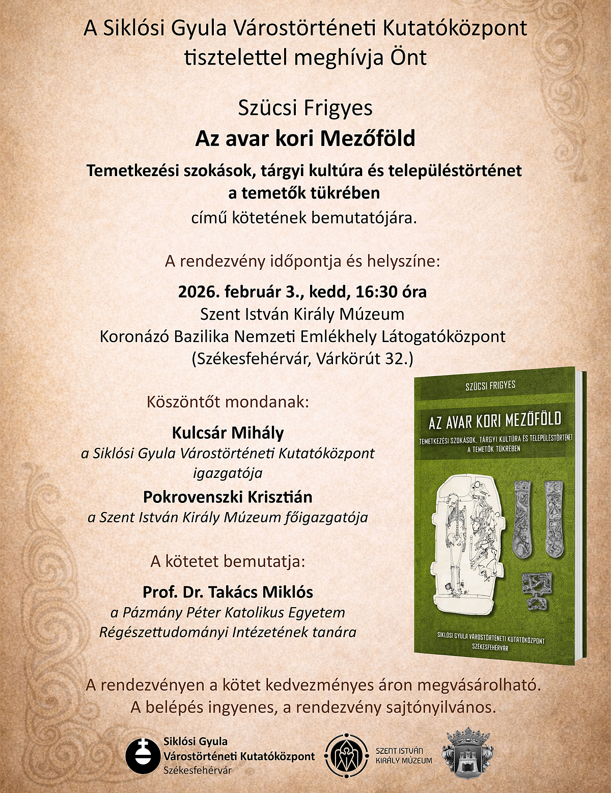 Február 3-án, kedden 16:30 órától kezdődik Szücsi Frigyes „Az avar kori Mezőföld” című könyvének bemutatója a Koronázó Bazilika Nemzeti Emlékhely Látogatóközpontban. A Siklósi Gyula Várostörténeti Kutatóközpont kiadványaként megjelenő kötet Székesfehérvár tágabb környezetének, a mezőföldi középtájnak az avar kori (6–9. századi) múltját mutatja be, összefoglalva az elmúlt több mint 100 év kutatásainak az eredményeit.