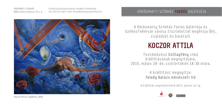 Május 28-án, csütörtökön 18:30-kor tartják az évad utolsó kiállítás- megnyitóját a Vörösmarty Színház Forrás Galériájában. Koczor Attila festőművész tárlata június 16-ig látható. Koczor Attila festőművész 1991-ben született Székesfehérváron. Tanulmányait 2010-ben kezdte meg a Magyar Képzőművészeti Egyetemfestészet szakirányán.