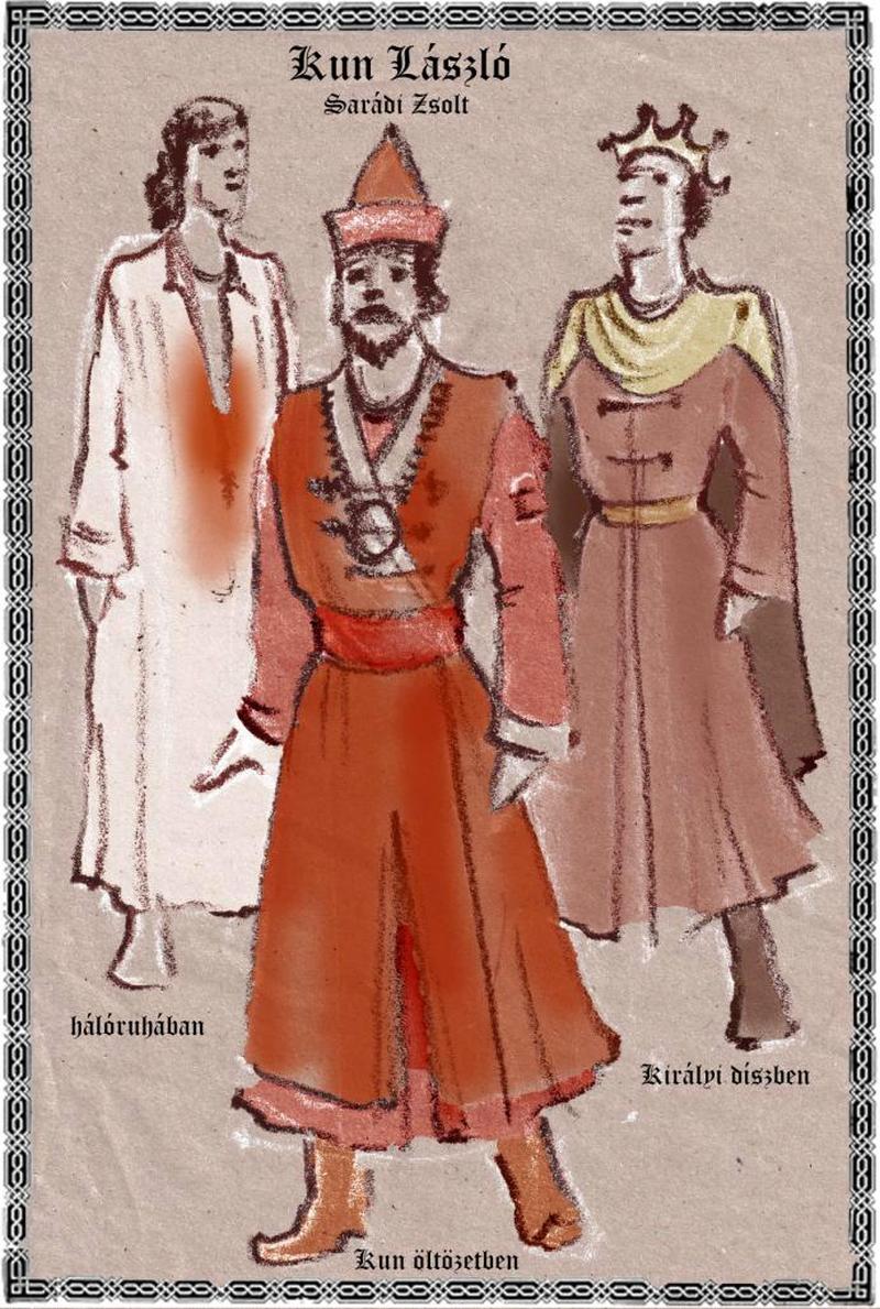 „Egy európai viseletben kezdi, ahogy az Nemes Mihály ábrázolásaiban is látható, utána felvesz egy kun viseletet idéző kaftánt. Teljesen más a két stílus. Az európai, egy visszafogottabb, egyenes vonalú, letisztultabb, harisnyás, térdig érő tunikákkal, palástokkal, lágyan omló anyagokkal, míg a kun őrzi az ősi keleti motívumokat. Arra a kun viseletet idéző kaftánra vált, amit a Képes Krónikában is láthatunk az ő ábrázolásában. A nőknél szintén megjelenik ez a markáns különbség. László felesége, Izabella, Anjou-herceg lánya – aki a nyugati kultúrát képviseli – egy rideg európai szépség. Kicsit úgy néz ki, mint a kora reneszánsz festményeken a nők. Azt a divatot is viseli. Egy leples, egyszerű, letisztult európai vonalat. A ridegségét hideg színekkel szerettük volna kifejezni, míg a kun szeretőket direkt kaftánokba és fülledt színekbe öltöztettem.”
