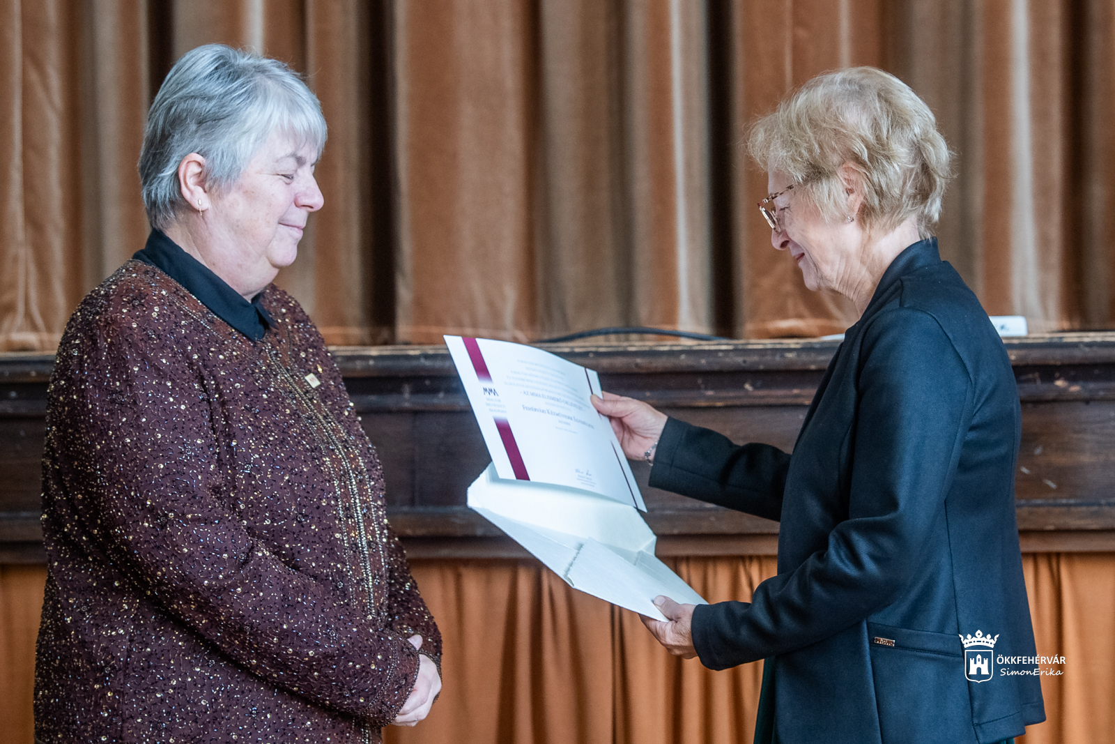 A Magyar Művészeti Akadémia Népművészeti Tagozatának elismerő oklevelét Landgráf Katalin textilművész nyújtotta át, aki maga is tagja a patinás székesfehérvári egyesületnek.