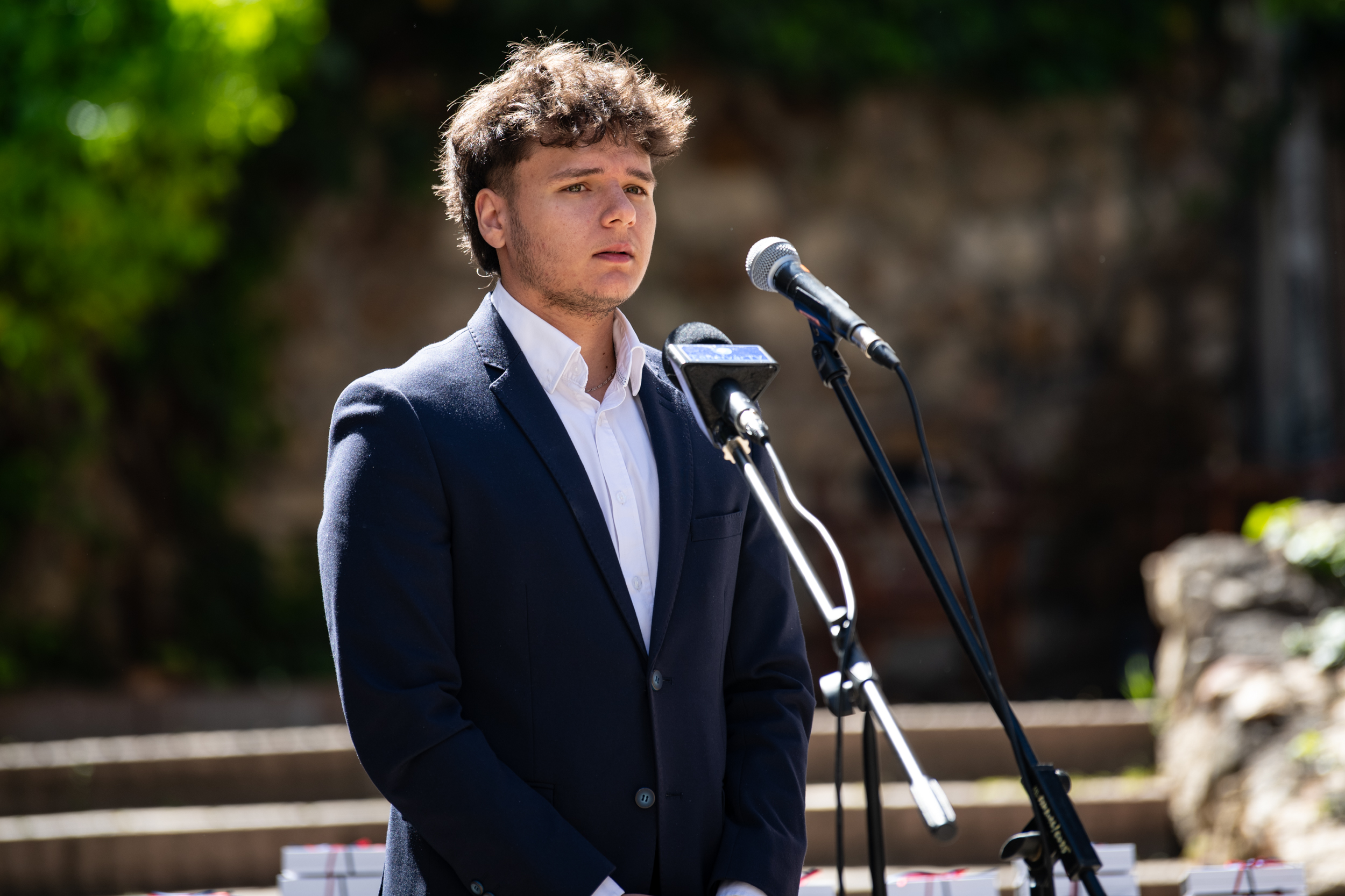 „Köszönetet mondunk minden gondoskodó szóért, minden osztálykirándulásért, minden összemosolygásért és minden, órán elsütött poénért. Útravalóként pedig minden diák magával viheti azt a láthatatlan csomagot, amelyben nem tankönyvek és füzetek, hanem egy értékrend, közös élmények és az iskolás éveink emberi arca van.” – zárta gondolatait Pető Marcell.