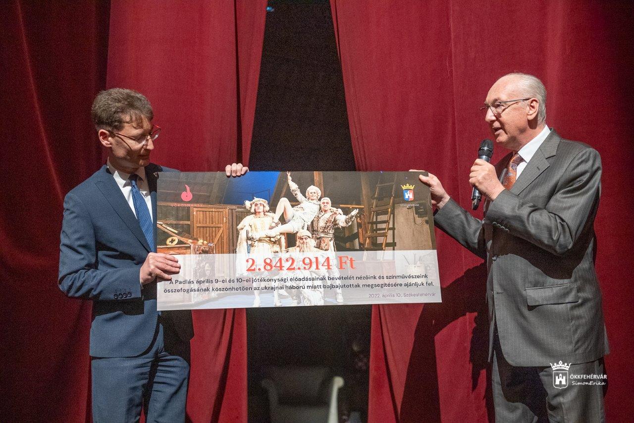A Székesfehérvárról és a megyéből érkezők segítő szándékáért mondott köszönetet a vasárnap délutáni előadást megelőzően dr. Szikora János. A Vörösmarty Színház igazgatója ekkor adta át a jótékonysági előadásokból befolyt 2.842.914 forintot jelképező csekket Székesfehérvár polgármesterének. Dr. Cser-Palkovics András a színház valamennyi dolgozójának megköszönte a nemes felajánlást, és köszönetet mondott a nézőknek, hogy a támogatói jegyek vásárlásával közel hárommillió forinttal járultak hozzá az Ukrajnából a háború elől menekülők támogatásához. „Óriási összesfogást tapasztaltunk az első pillanattól kezdve a civil és egyházi szervezetek, az önkormányzati intézmények, az állami hatóságok, hivatalok részéről, hogy az ideérkezőknek segítséget, támogatást tudjunk nyújtani. Jó volt megtapasztalni, hogy képesek vagyunk összefogni.”