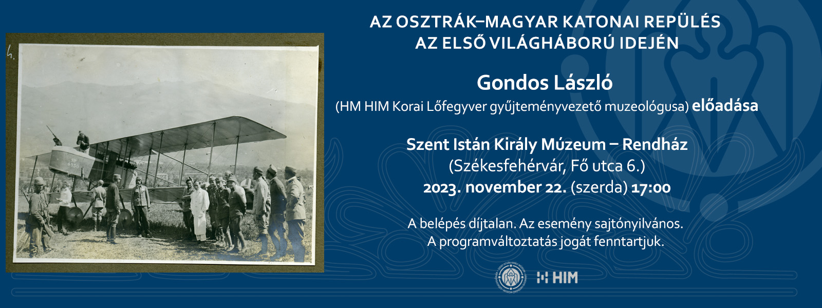 A november 22-én, szerdán 17.00 órakor kezdődő előadást Gondos László, a Hadtörténeti Intézet és Múzeum Korai Lőfegyvergyűjteményének vezető muzeológusa tartja Az osztrák-magyar katonai repülés az első világháború idején címmel. Az előadás az Osztrák-Magyar Monarchia légierejének történetét mutatja be 1910-től 1918 novemberéig.
