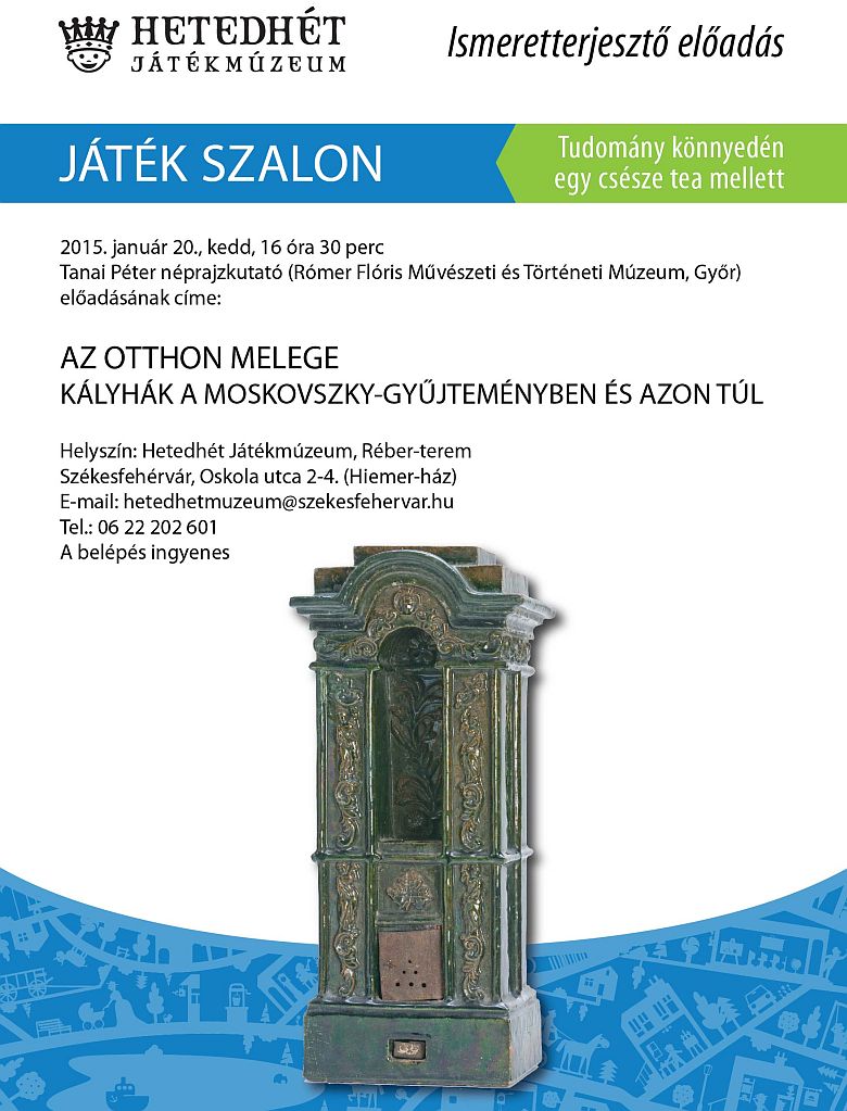 Január 20-án, kedden ismét várnak minden érdeklődőt a Játékszalon nevű rendezvényre a Hetedhét Játékmúzeumban (Oskola utca 2-4.). A délután 16.30-kor kezdőd eseményen Tanai Péter néprajzkutató tart előadást Az otthon melege – kályhák a Moskovszky- Gyűjteményben és azon túl címmel. Az előadásra ingyenes lesz a belépés.