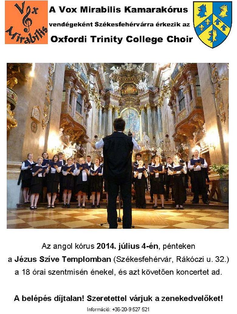 A székesfehérvári Vox Mirabilis Kamarakórus vendégeként Székesfehérváron és Budapesten koncertezik az Oxfordi Trinity College Choir. A neves angol kórus 2014. július 4-én, pénteken 18.00 órakor a Jézus Szíve templomban a szentmisén énekel a neves angol kórus. A szentmise után rövid koncertet is adnak a Vox Mirabilis Kamarakórussal együtt. A híres angol kórus számos díjat és elismerést kapott már szerte a világban, az utóbbi években vendége volt Európa összes nagyvárosának. A pénteki koncertre a belépés díjtalan! Szeretettel várják a zenekedvelőket!