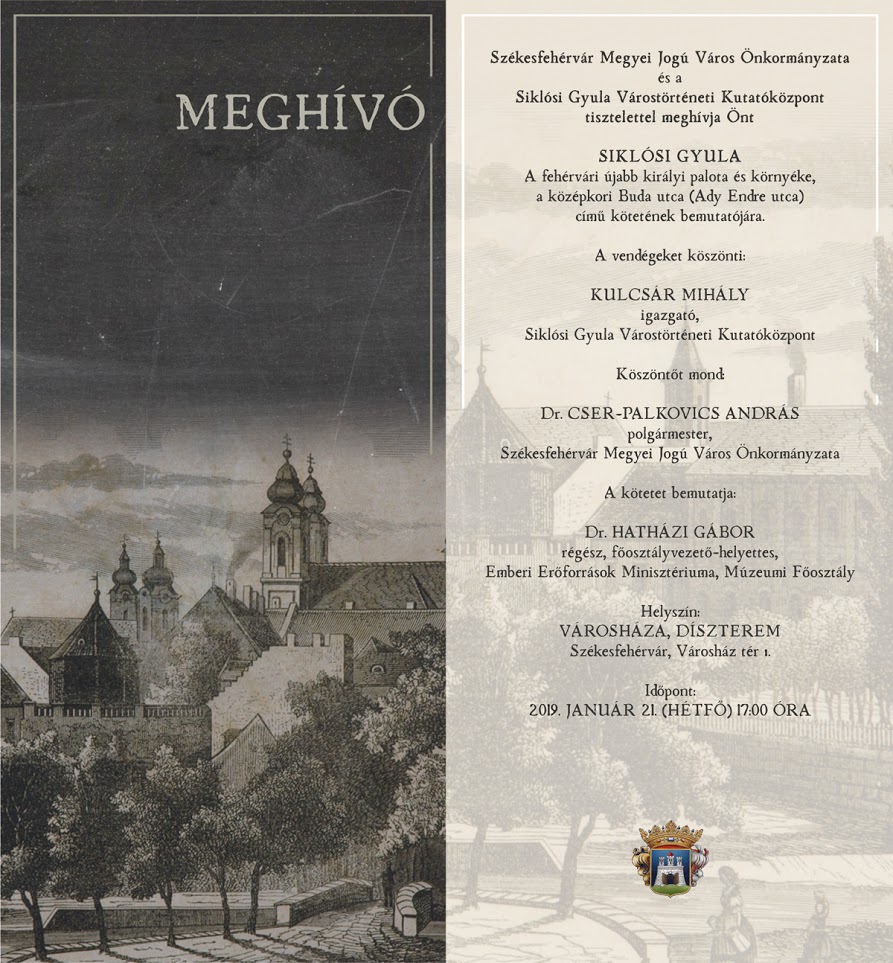 "A fehérvári újabb királyi palota és környéke, a középkori Buda utca (Ady Endre utca)" címet viselő írást ünnepélyes keretek között a Városháza Dísztermében Dr. Hatházi Gábor, az Emberi Erőforrások Minisztériuma Múzeumi Főosztályának főosztályvezető-helyettese mutatja be. Az eseményen dr. Cser-Palkovics András polgármester és Kulcsár Mihály, a Siklósi Gyula Várostörténeti Kutatóintézet igazgatója mondanak köszöntőt. A programon az érdeklődők a kötetet kedvezményes áron meg is vásárolhatják.