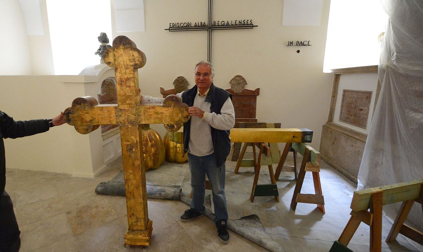 A Bazilika tornyának keresztjét leszerelték és az altemplomban várja az aranyozást. A tervek szerint május végére visszakerülnek a tornyokra.
