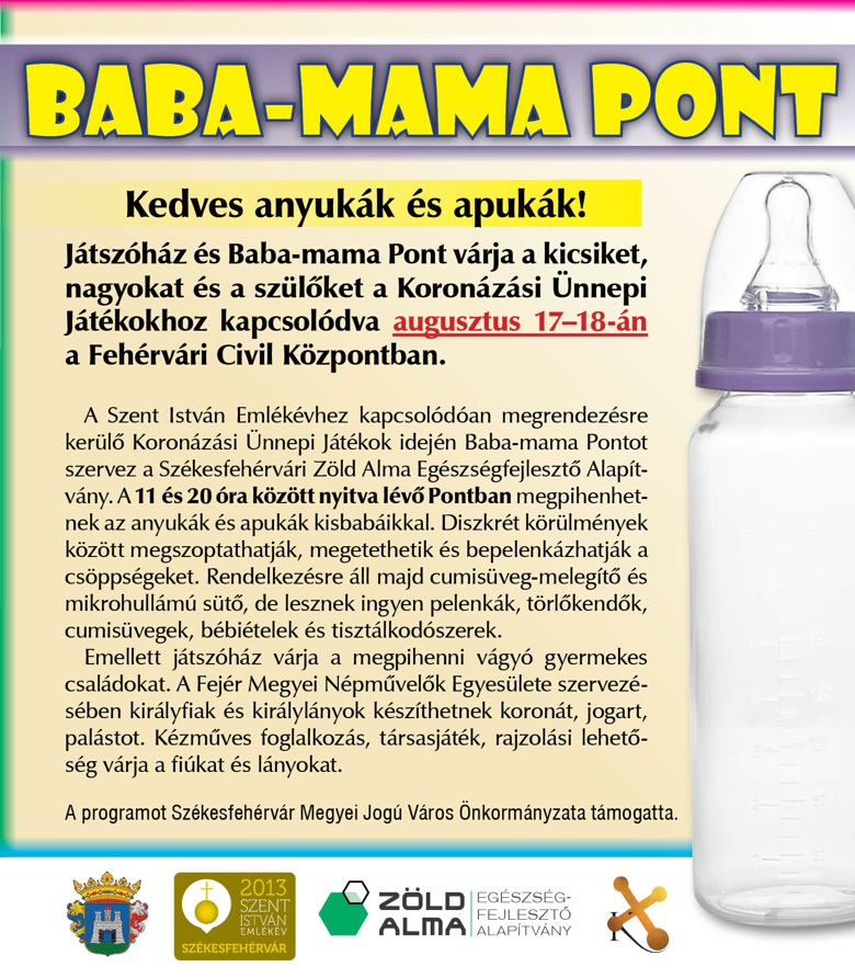A Fejér Megyei Civil Információs Centrum két programmal csatlakozik a Koronázási Ünnepi Játékokhoz 2013. augusztus 17-18-án. Szombaton és vasárnap 11-20 óra között Baba-mama Pont és Játszóház működik majd a Fehérvári Civil Központban.