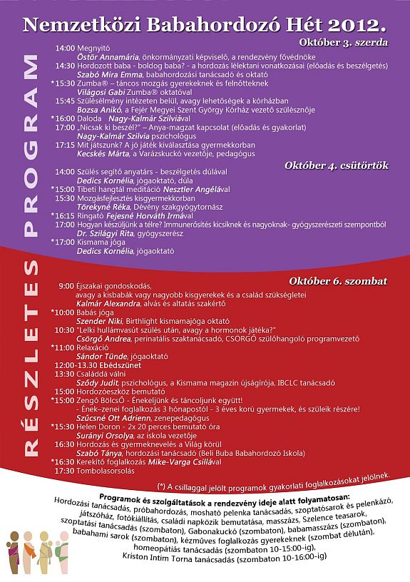 A Székesfehérvári Babahordozó Klub 2012-ben immár negyedik alkalommal vállalkozik arra, hogy a rendezvény keretében színvonalas és gazdag programokat kínáljon a családok számára: a babahordozás ismertetésén és népszerűsítésén túl céljuk, hogy a kisgyermeket tervező, váró és nevelő szülők megismerjék a kötődő neveléshez kapcsolódó alapvető információkat, beszélgethessenek a kisgyermek testkontaktusra, szeretgetésre irányuló igényéről és a kapcsolódó tévhitekről.