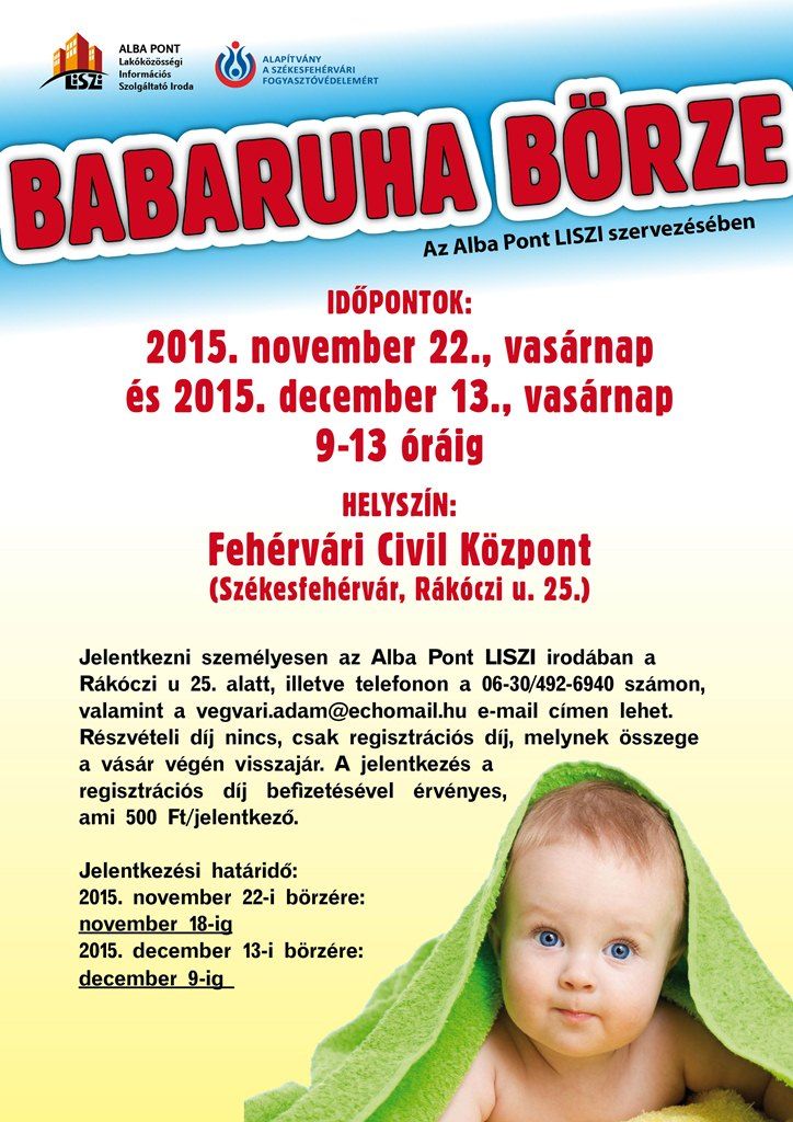Két éve nyitotta meg kapuit az Alba Pont LISZI a Fehérvári Civil Központban. Az elmúlt évek során számos olyan programot kínált az iroda a városrészben élőknek, amely hiánypótló voltak. Az Alba Pont LISZI ezt a hagyományt követve hirdet Babaruha Börzét a Központban. Harmincöt asztal áll rendelkezésre, amelyek kiosztása jelentkezési sorrendben történik majd. A programot a Fehérvári Civil központ emeletén rendezik, ezért a sok lépcső és a szőnyegpadló borítás miatt, babakocsit nem lehet felvinni majd a Börzére.