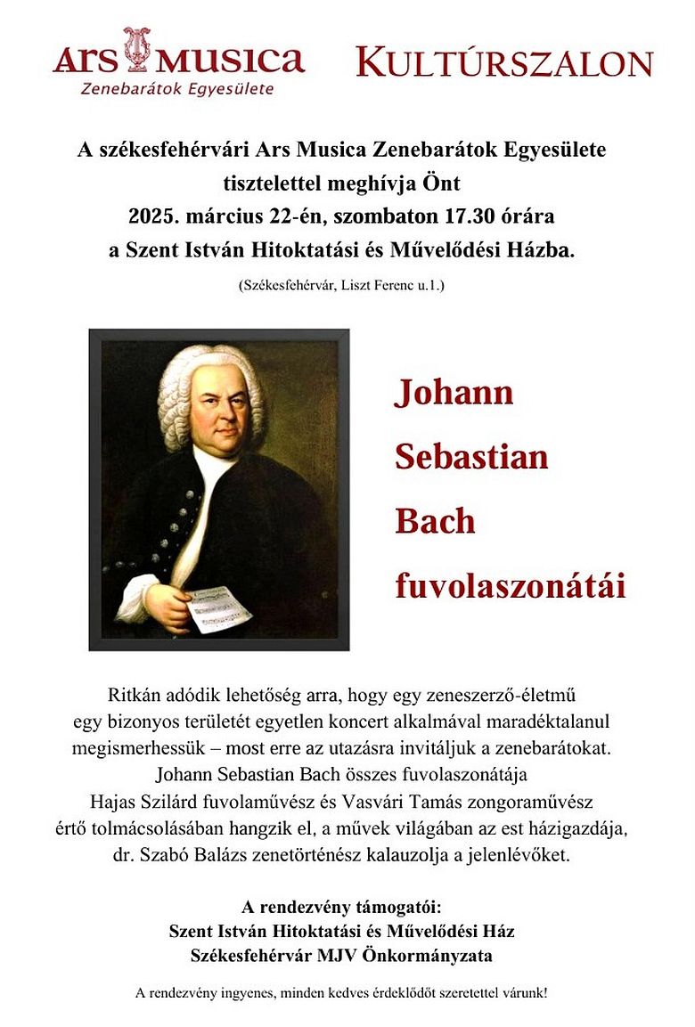 Az Ars Musica Zenebarátok Egyesülete szervezésében folytatódik a Kultúrszalon, melynek legújabb programján Johann Sebastian Bach összes fuvolaszonátáját hallhatja a közönség.