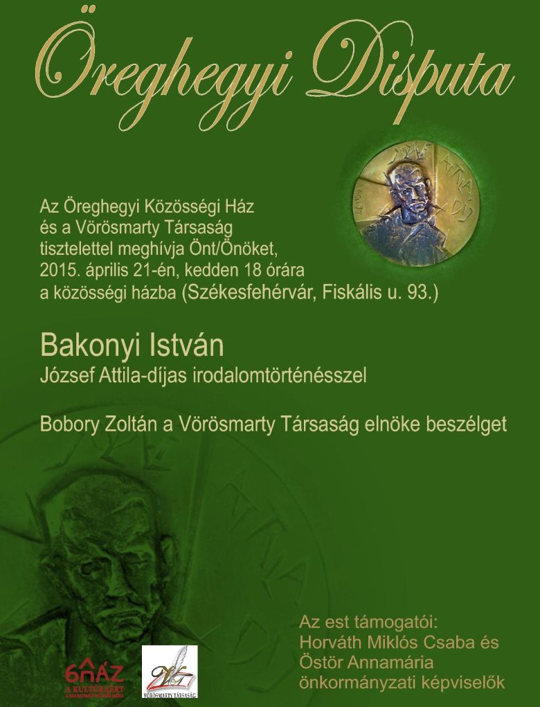Ismét kulturális programra várnak minden érdeklődőt 2015. április 21-én, kedden az Öreghegyi Közösségi Házba (Fiskális utca 93.). Az Öreghegyi Disputa következő vendége Bakonyi István József Attila-díjas irodalomtörténész lesz, akivel Bobory Zoltán beszélget. Az esemény kedden este 18 órakor kezdődik, melyre mindenkit szeretettel várnak a szervezők.