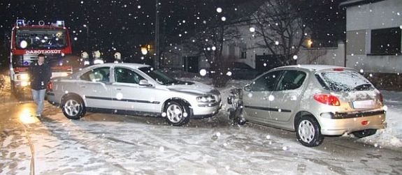 Összeütközött két autó csütörtökön kora este Székesfehérváron a Zámoly utcában. Egy Volvo S60-as a havas úton megcsúszott és a bal elejével egy Peugeot bal elejének ütközött. A Volvo keresztbe fordult az úton. A mentők három ember – az elsődleges adatok alapján – könnyebb sérülésekkel szállítottak kórházba. A tűzoltók áramtalanították a személygépkocsikat.